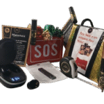 Krimwell triangular bubble-wrap gift bag with cheerful Christmas print and carrying cord, containing: